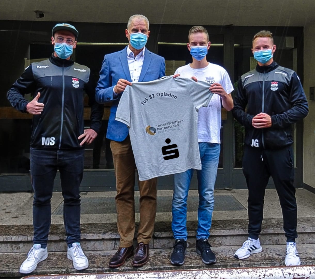 Foto: Markus Sonnenberg (sportlicher Leiter Senioren), Reymund Hermanski (Filialleiter Sparkasse Leverkusen), Mika Linder (BFD TuS 82), Jonas Gördes (Sportlicher Leiter Jugend) (Quelle: NM/TuS 82)